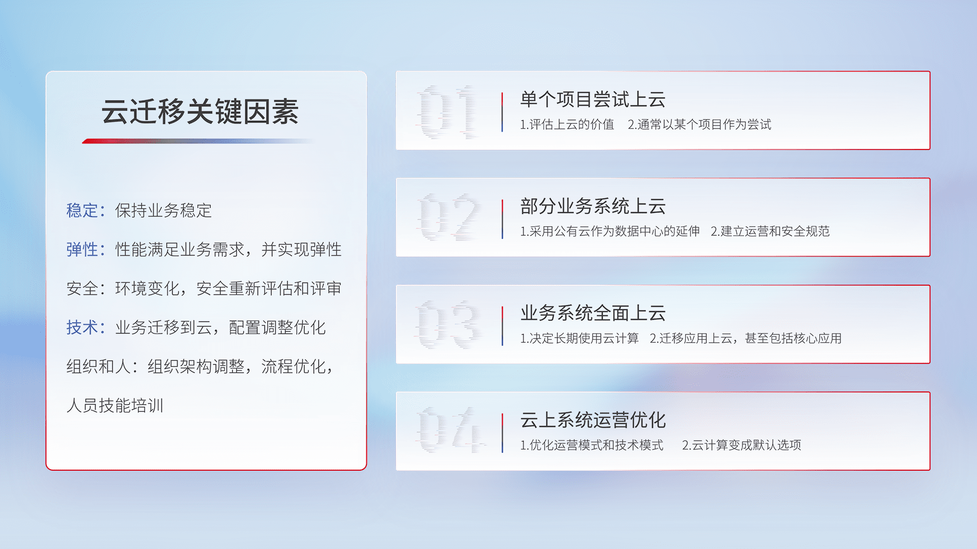 结合实际业务,,从规划设计、、云平台选型、、、、云原生改造、、、数据迁移、、集成交付,,,迁移全过程为客户识别最佳上云路径,,,做好风险识别管理,,,,设计网络架构、、、身份权限、、、安全审计合规、、操作审计、、日志审计、、、、监控告警策略、、多站点容灾设计等,,,,对云上基础设施进行整体规划,,提升IT治理水平,,以满足弹性、、、、高可用、、、、高性能的需求。。。。