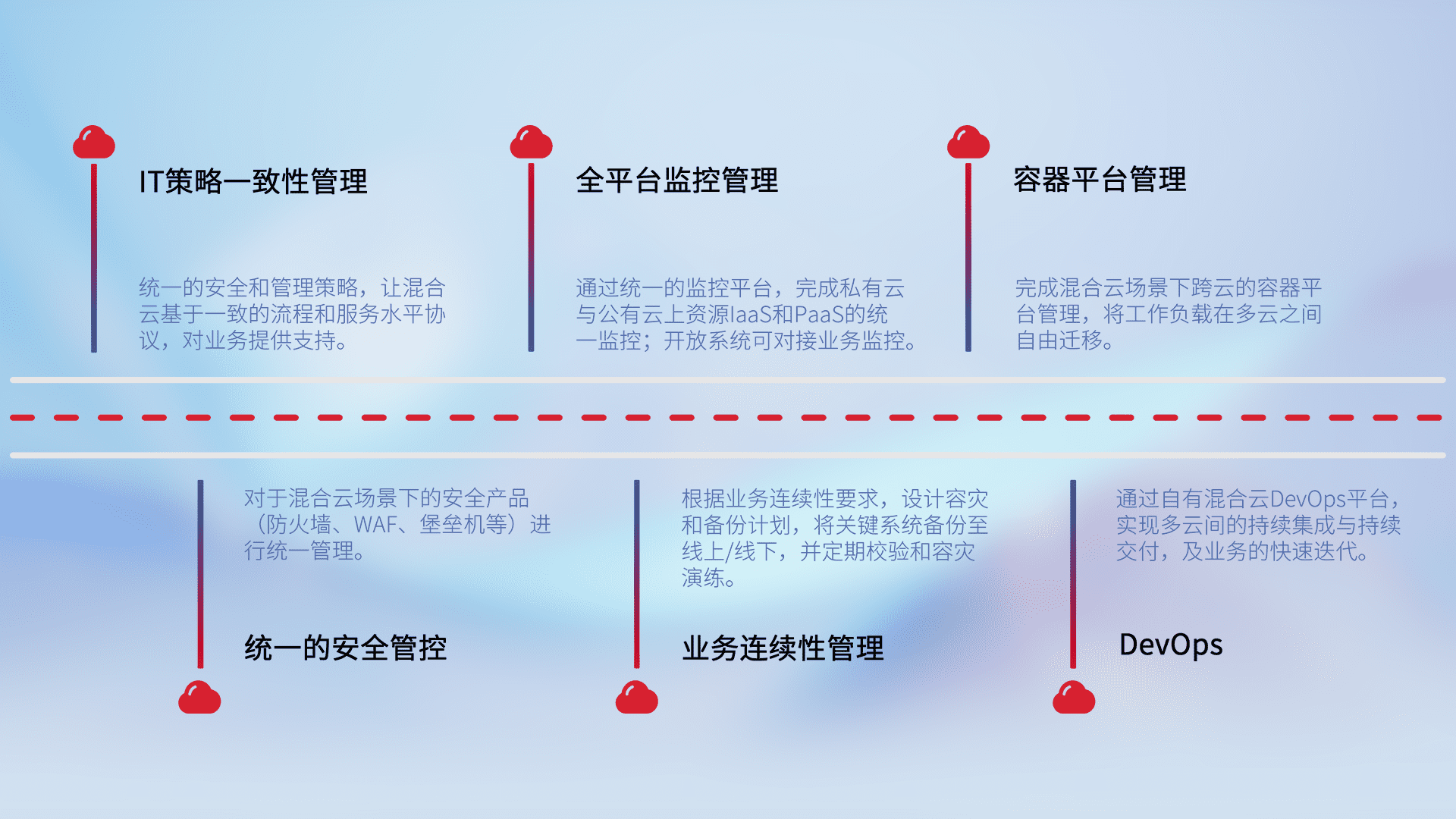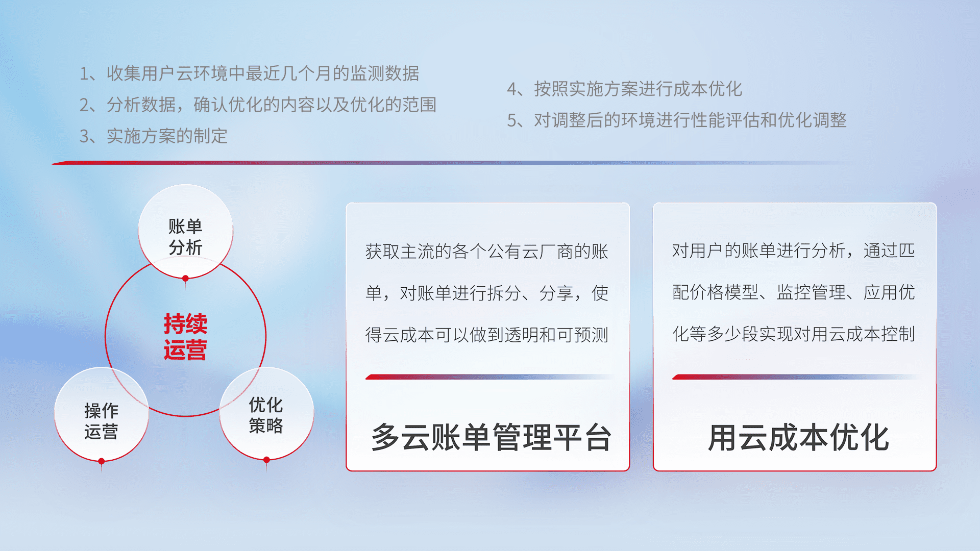 通过多云纳管,,以统一的资源数据模型把客户的云资源进行抽象和封装,,进而实现对多云资源的统一操作,,,保障云资源管理的可靠性、、、、稳定性与可用性。。。量身定制化运维内容,,,配置、、、、开发运维、、、、补丁管理、、、、备份、、监控、、认证和访问管理、、、、审计和日常巡检等,,,,保障在用云过程中的可靠度,,,稳定度以及高可用率。。。