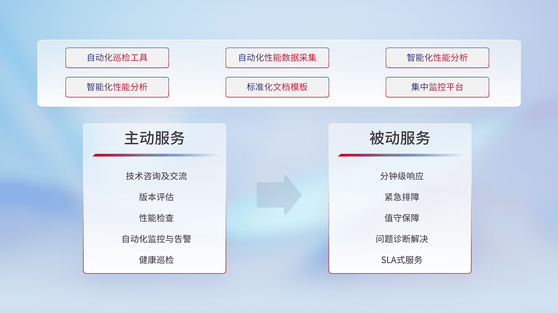 智能化工具和标准化文档,,保障服务质量,,,,提供主动服务(包含技术咨询、、版本评估、、性能检查、、自动化监控与告警、、健康巡检)和被动服务包含(分钟级响应、、紧急排障、、值守保障、、、、问题诊断解决、、、SLA服务)。。